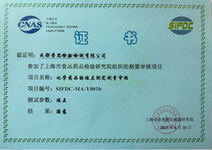 近日,成都普思生物科技股份有限公司旗下子公司“成都普思檢驗檢測有限公司”通過了由上海市食品藥品檢驗研究院于2025年組織的測量審核項目“化學藥品的熔點測定”,結果為“滿意”。